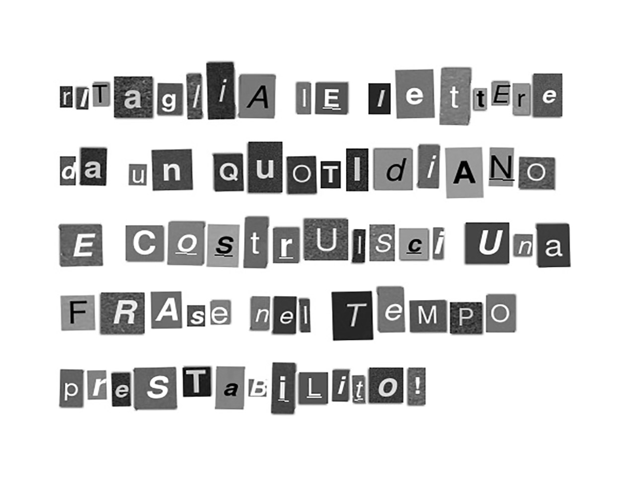 Passatempo divertente e utile per sviluppare le capacità linguistiche, col quale possono cimentarsi dai due giocatori in su. Occorrono un vecchio quotidiano, un paio di forbici e una scatola (o un contenitore qualunque). Prima di iniziare, è necessario ritagliare dal giornale le parole dei titoli (con l’accortezza di prendere anche articoli, preposizioni e avverbi) e mescolarle nella scatola. Al segnale d’inizio, i giocatori dovranno comporre una frase di senso compiuto utilizzando i ritagli, entro un tempo prestabilito. Vince chi compone la frase più lunga.