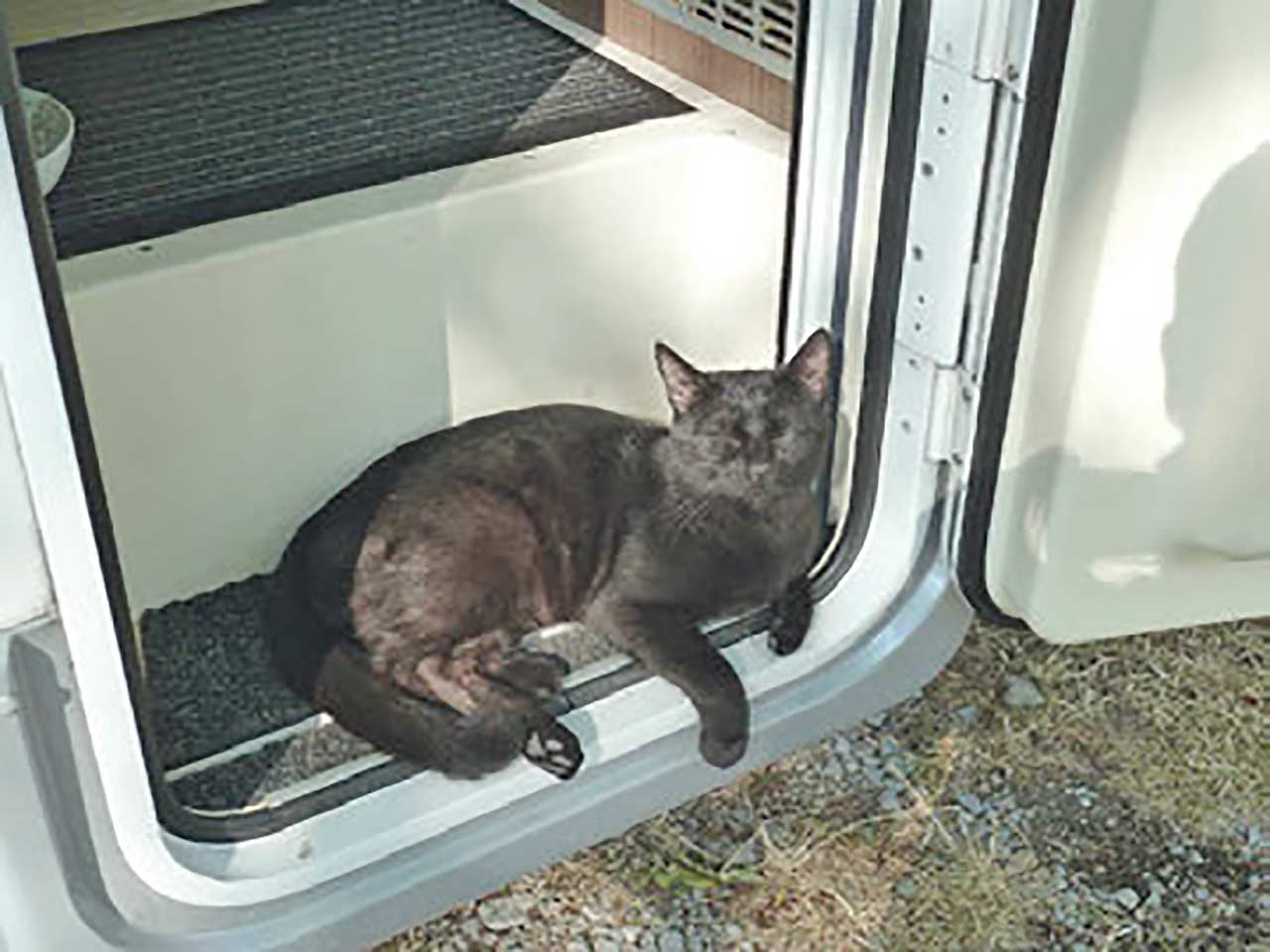Piggy, Mhu, Relé e Dwight si sono impratichiti stando in una gabbia ausiliaria e ora viaggiano tranquilli in garage. Ide e Dev, fratelli diversi, si sono abituati da subito: uno tiene stretta la sua palla per tutto il viaggio, mordicchiandola come antistress, l’altro tende a deprimersi e va stimolato giocandoci con la corda ma non scenderebbe mai dal camper, neppure quando sostiamo nei Fido Park.