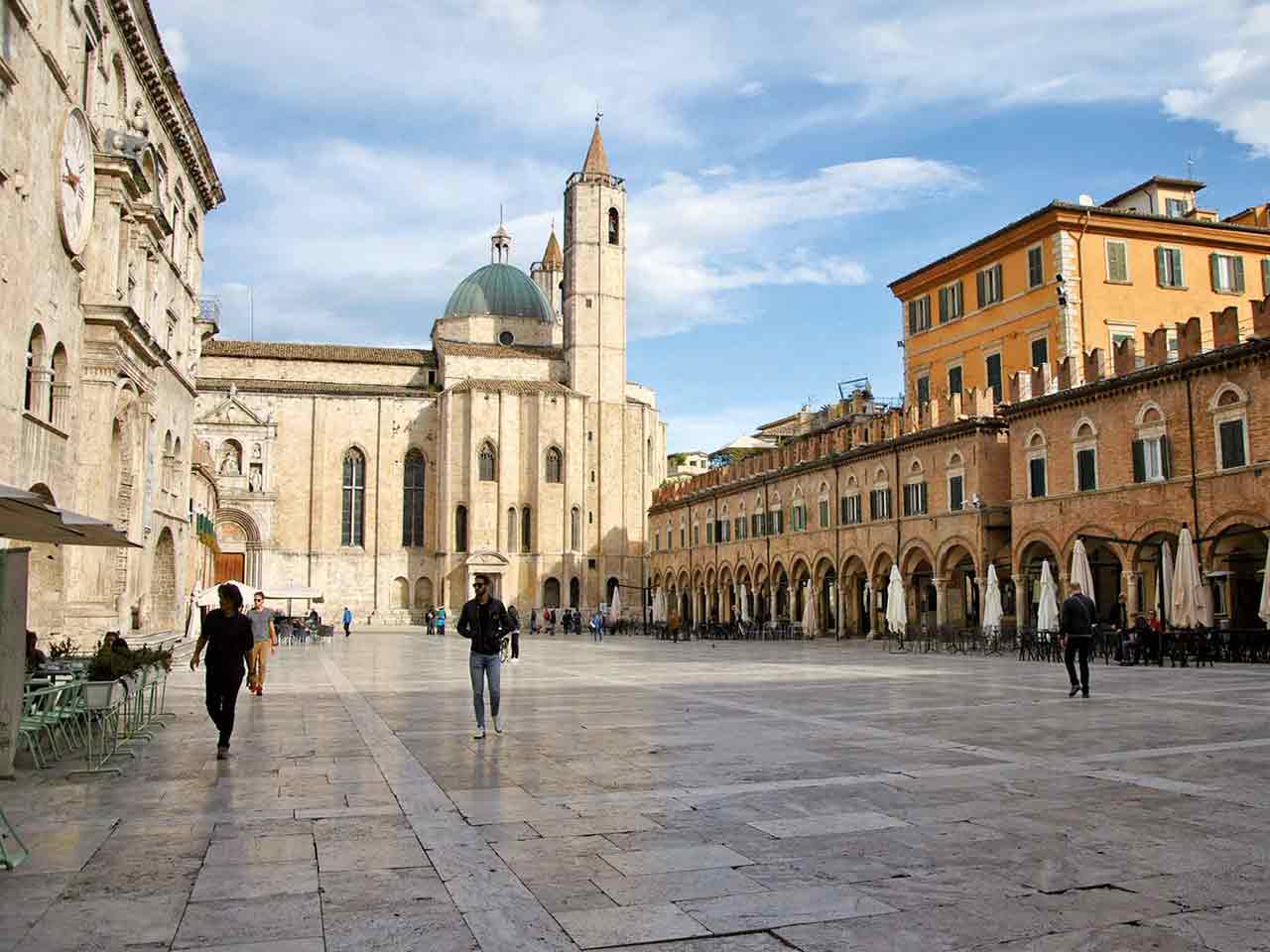 Con il suo pavimento lastricato e lucido, reso ancora più elegante dal portico che ai primi del Cinquecento accoglieva le botteghe artigiane, Piazza del Popolo è il salotto della città. Su un lato spicca il duecentesco Palazzo dei Capitani del Popolo, affiancato dall’antico Caffè Meletti in stile liberty. Qui puoi gustare l’Anisetta, il famoso liquore all’anice, in numerose versioni. Sull’altro lato della piazza c’è la chiesa di San Francesco col portale gotico in travertino. Con una breve camminata arriviamo a Piazza Arringo (chiamata così perché un tempo sede delle adunanze popolari), sulla quale si affacciano la cattedrale di Sant’Emidio (il patrono di Ascoli), il battistero di San Giovanni e il Palazzo dell’Arengo, sede del Comune e della Pinacoteca Civica.