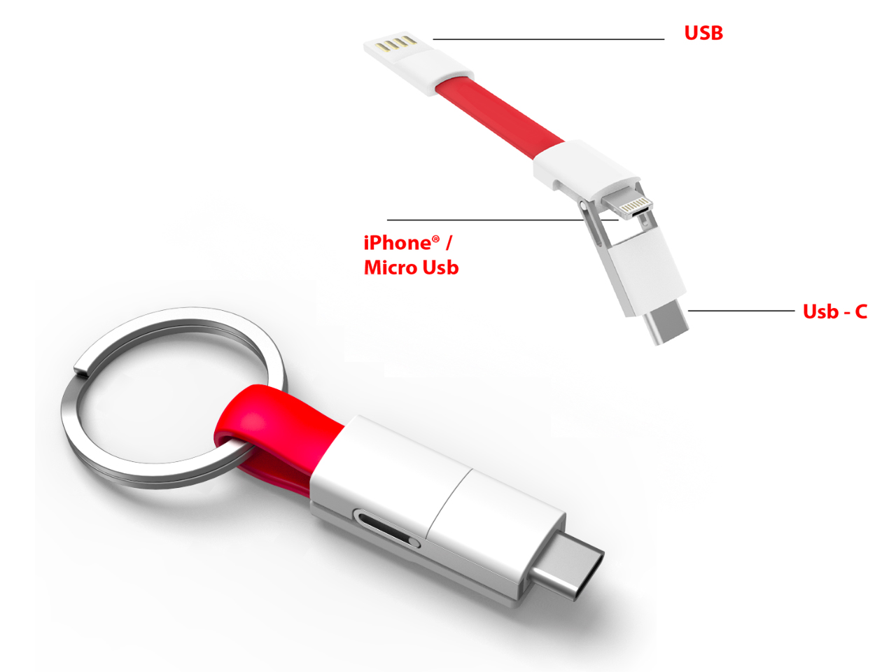 Il cavo portachiavi universale Smart Ring elimina il problema della batteria scarica e della sincronizzazione di qualsiasi smartphone! In un’unica, piccolissima ed elegante soluzione ottieni ingressi compatibili con le tecnologie Lightning (Apple®) dell’iPhone®, Micro USB (Android) e USB-C (anche alcune di ultima generazione).
