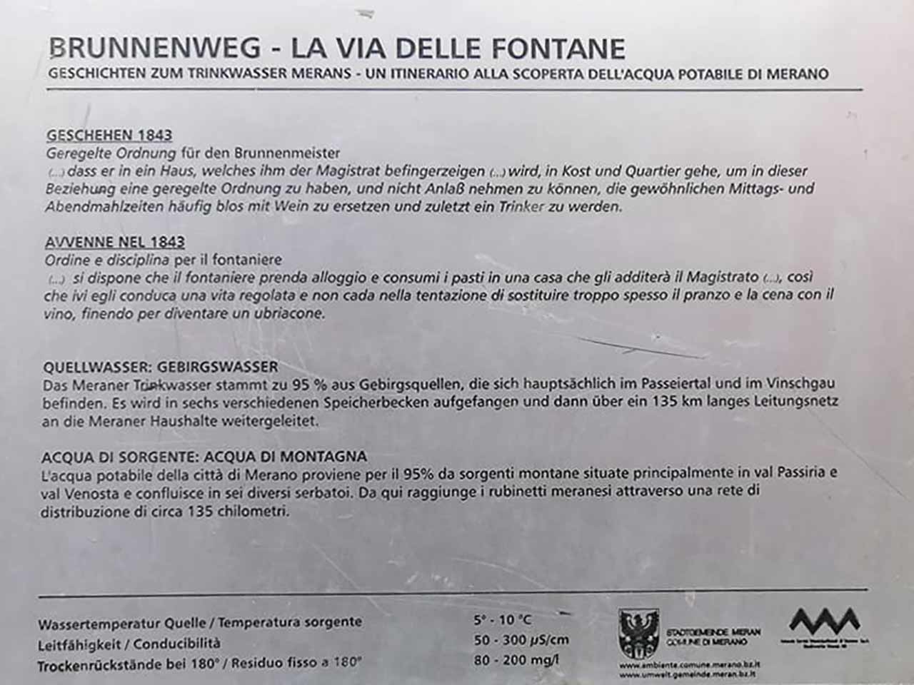 L’itinerario comprende 12 tra le fonti di Merano, situate in parte nel centro storico e in parte sulle Passeggiate. Ognuna di loro presenta una targa che riporta un episodio curioso della storia dell’acqua in città. Si deve alla ricercatrice locale Renate Abram l’idea di un percorso storico legato più alle curiosità che al preciso ordine cronologico. Le tavole a corredo delle fonti riportano infatti episodi particolari, ordinanze e provvedimenti sull’acqua disposti dai signori del tempo o dalle amministrazioni cittadine. Ne scaturisce un’interessante storia dell’acqua a Merano dal 1462 fino ai giorni nostri.