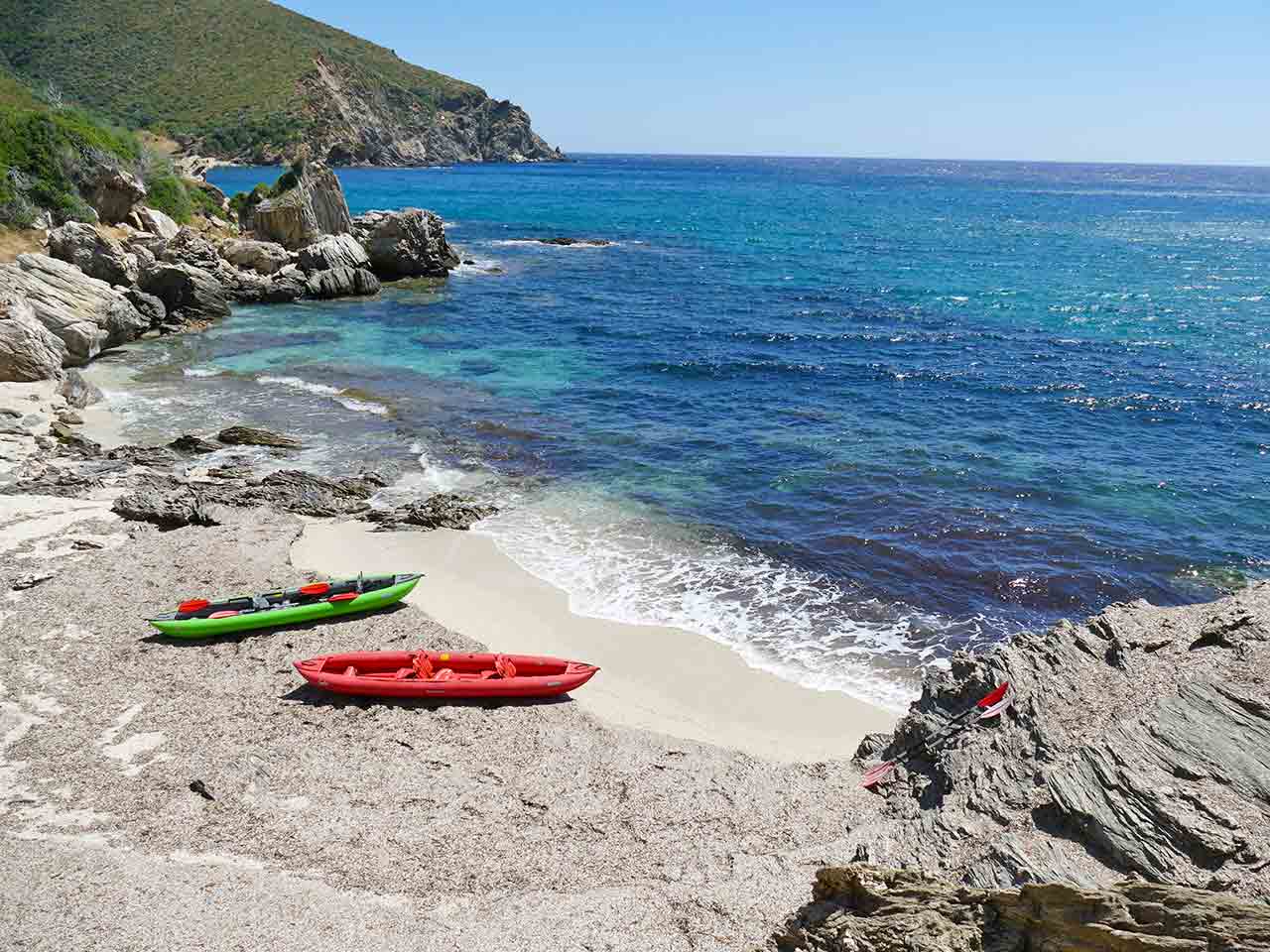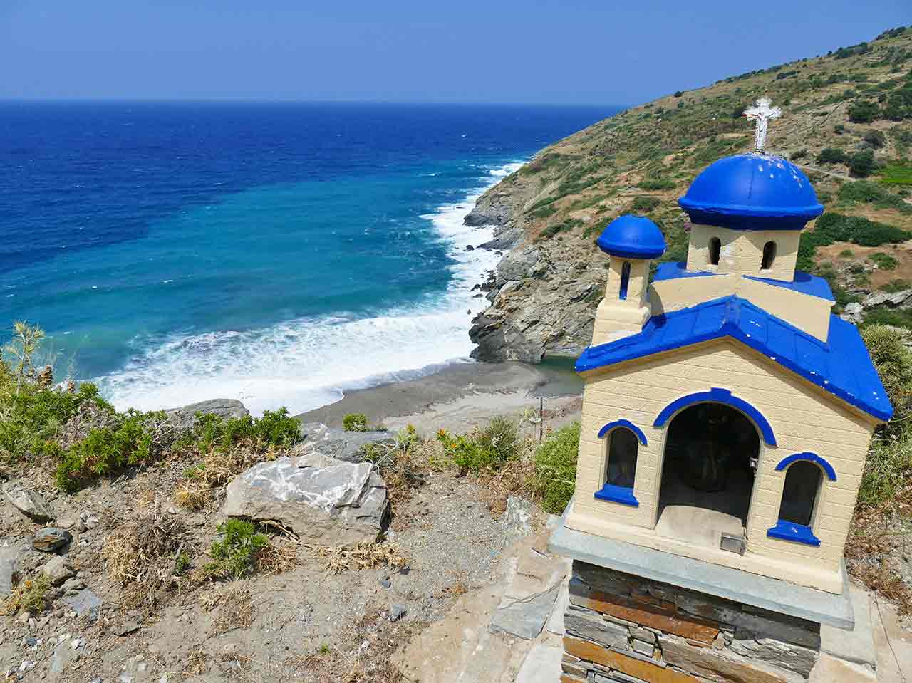 Raggiungiamo l’Isola di Eubea a Calcide, che dista solo quaranta metri dalla terraferma. Proseguiamo poi per Marmari. Di fronte alla cittadina troviamo nove piccole isole, chiamate Petaloi. Nel golfo il vento soffia forte in ogni stagione, infatti sulla spiaggia di Zastani si incontrano appassionati di kite surf da tutta Europa. Il luogo si presta bene a qualche giorno di sosta: su una spiaggetta dai colori straordinari si può disporre di doccia e acqua corrente.