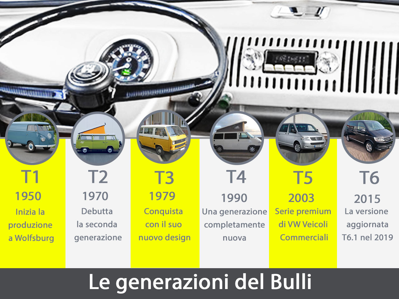 Un bestseller mondiale già alla sua prima generazione, che raduna ancora oggi appassionati e fan in manifestazioni in tutta Europa. Settant’anni dopo la sua nascita, il Volkswagen Transporter è diventato una vera icona, i veicoli usati d’epoca raggiungono ancora oggi i prezzi migliori sul mercato. Ripercorriamo la sua storia attraverso le sue sei generazioni di grande successo commerciale.