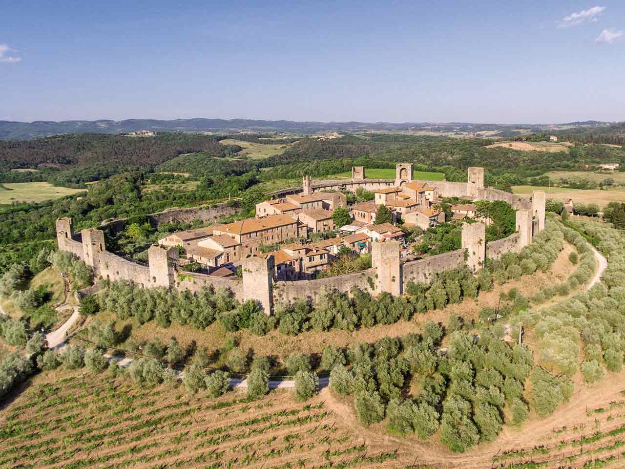 Sulle stesse spiccano quattordici torri, citate da Dante Alighieri nella Divina Commedia – “Monteriggion di torri si corona” – per raccontare la discesa al nono cerchio dell’inferno.