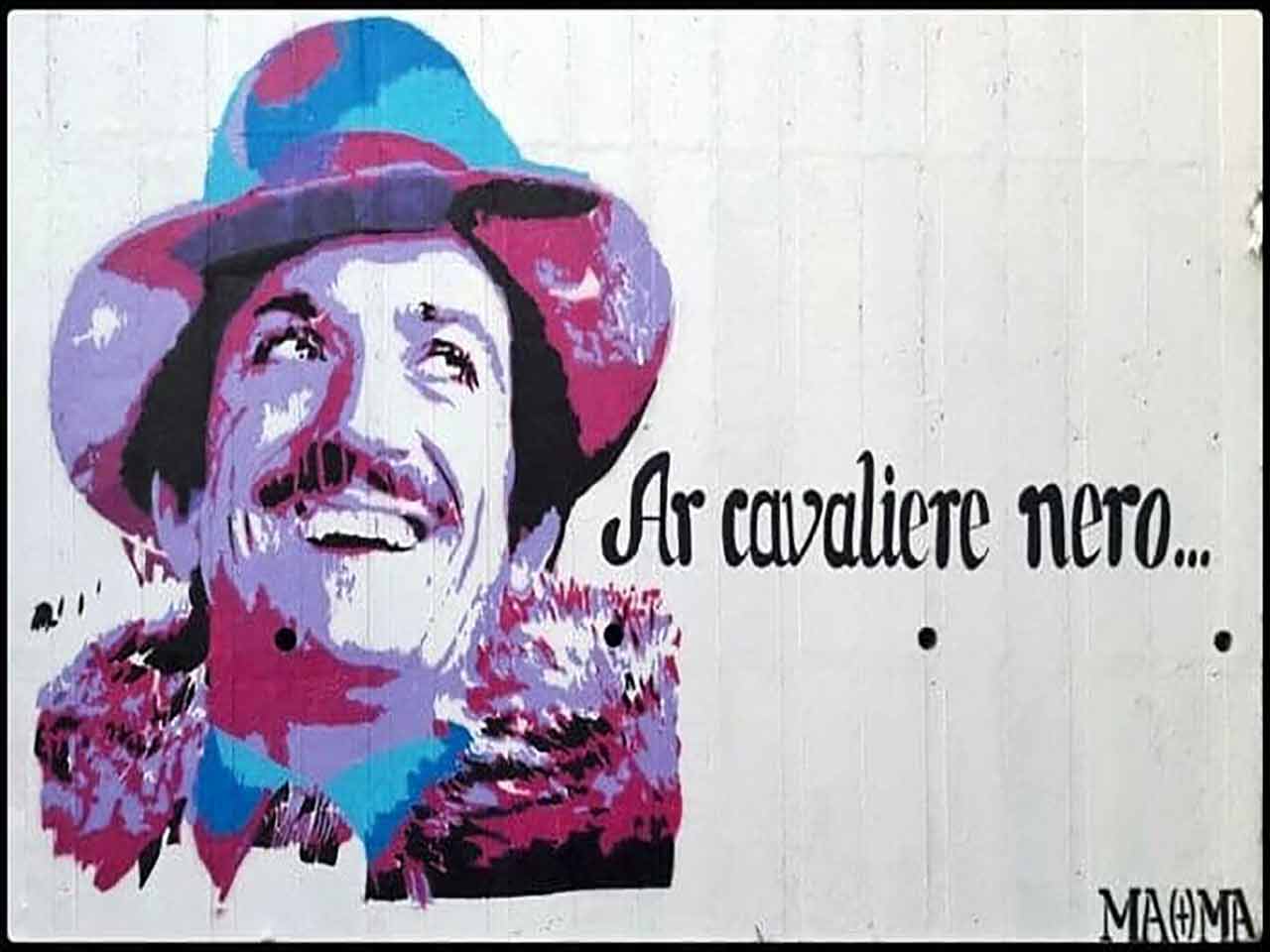 La coloratissima opera ritrae il volto sorridente dell’attore romano, con accanto la scritta “Ar cavaliere nero…” celebre conclusione di uno dei suoi cavalli di battaglia. L’opera è stata realizzata da Anna Maria Tierno, in collaborazione con l’associazione “Arte e città a colori”