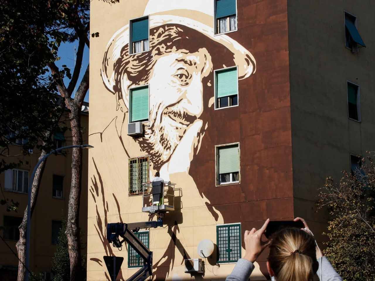 Il ritratto di 11×15 metri, realizzato dallo street artist Lucamaleonte, lo raffigura con il mitico cappello del personaggio di Mandrake e i colori giallorossi della Roma, la sua squadra del cuore, che ha contribuito al progetto insieme alla Regione Lazio e all’Azienda territoriale per l’edilizia residenziale.