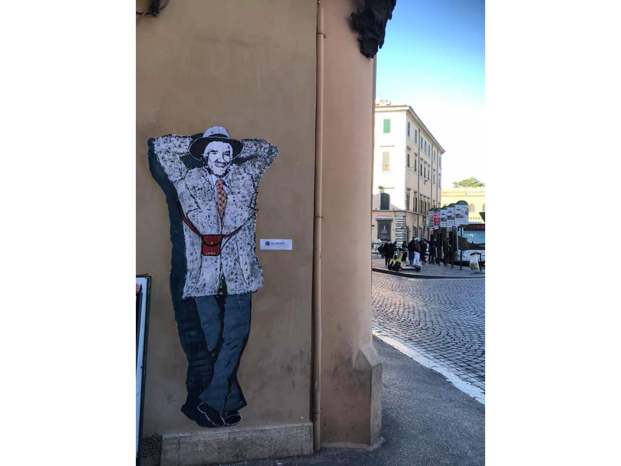 La street artist Laika, nella notte tra il 2 e il 3 novembre, ha attaccato un poster del grande attore in un luogo altamente simbolico: vicino all’ingresso di quello che, nel mitico film “Febbre da cavallo”, era il bar di Gabriella (Catherine Spaak), la fidanzata di Mandrake, uno dei celebri personaggi interpretati da Proietti. Il poster è comparso in pieno centro storico, tra Via della Tribuna di Tor de’ Specchi e Piazza d’Aracoeli, vicino all’ingresso del locale.