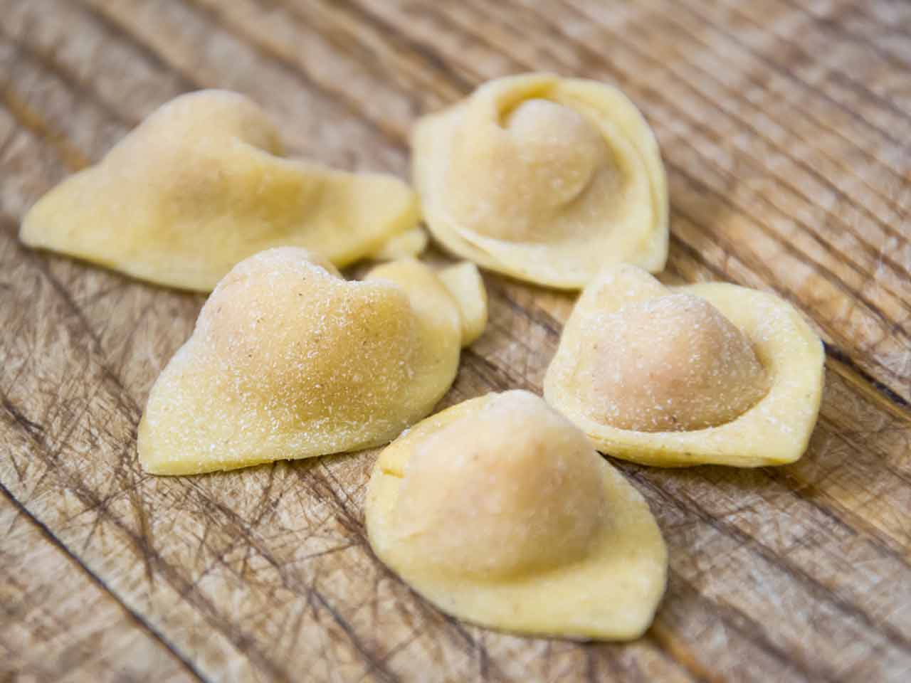 Farcisci con ricotta mescolata a sale, pepe e tartufo nero grattugiato. Chiudi i quadrati a fazzoletto: unendo i due angoli opposti otterrai un triangolo con al centro la farcitura di ricotta: unisci due angoli del triangolo e otterrai il tortellino.