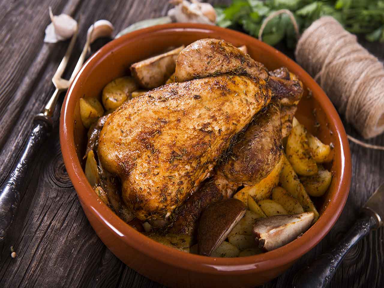 Per controllare la cottura, inserisci un coltello nel cuore del rotolo e appoggia la punta sul dorso della mano (non scotterà!). La faraona è pronta quando la temperatura del cuore è poco più che tiepida, oppure a 72° su un termometro da cucina.
