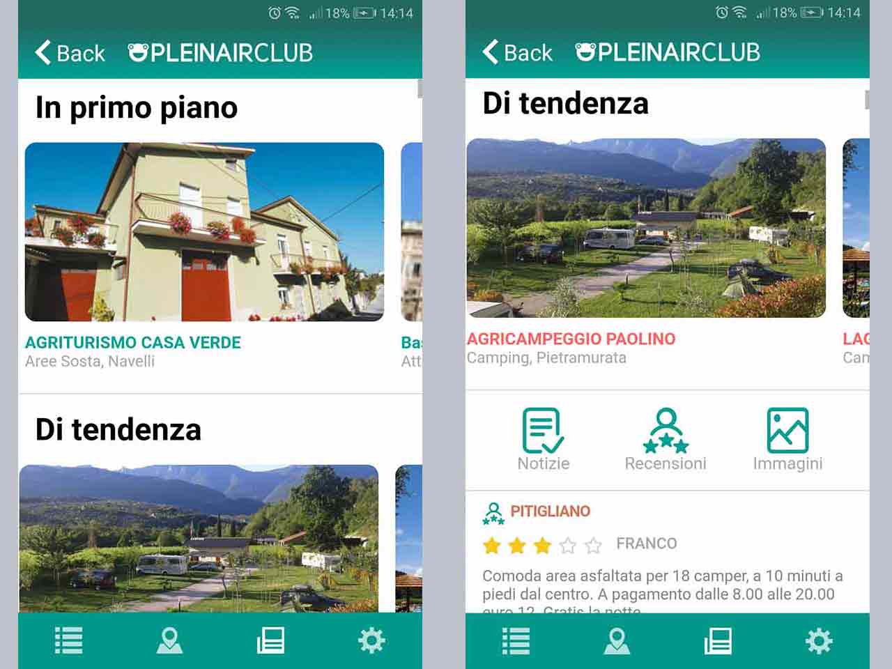 Tre aree dove potrai visualizzare l’elenco delle ultime notizie pubblicate su www.pleinairclub.it e comunicate tramite notifica, le ultime recensioni degli altri viaggiatori e le foto che gli utenti hanno scattato alle strutture.