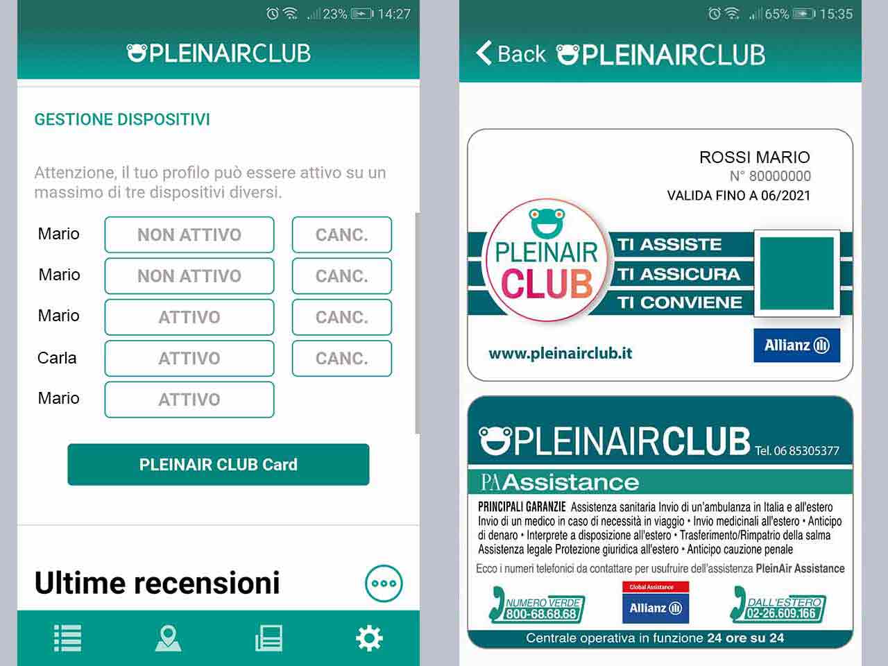 - Visualizzare la card virtuale del PLEINAIRCLUB, comodamente sul tuo dispositivo (la stessa funzione è raggiungibile anche direttamente dalla home page cliccando sull’icona della mano che regge la tessera)