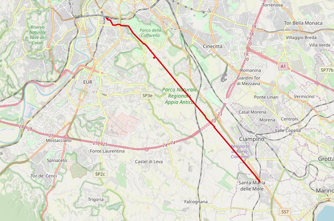 Roadmap Da Santa Maria delle Mole lungo l’Appia Antica fino all’incrocio con la Via Ardeatina e la Chiesa del Domine quo vadis. Poi per Parco Scott e la Circonvallazione Ostiense fino alla Stazione Ostiense.