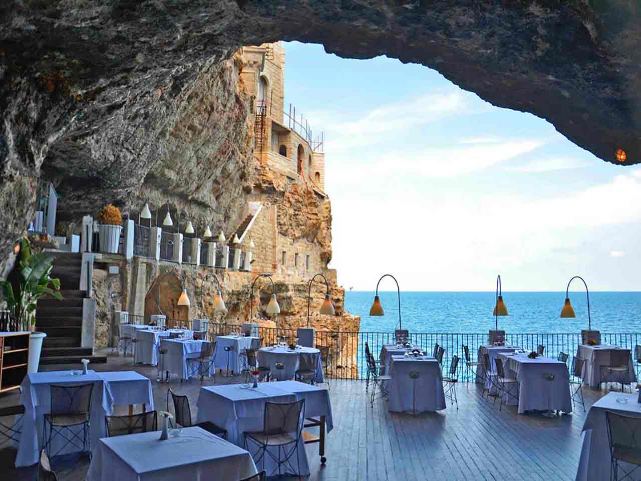 Un luogo magico e incantato, un ristorante con una terrazza ricavata all’interno di una grotta naturale, sicuramente una delle location più particolari e romantiche del mondo. Un posto esclusivo e ricco d’atmosfera, utilizzato per feste e banchetti fin dal 1700, come testimonia un acquerello del 1783 di Jean Louis Desprez. I colori del giorno fanno risplendere la bellezza del paesaggio costiero, mentre quelli della sera, al tramonto, creano sfumature indimenticabili.