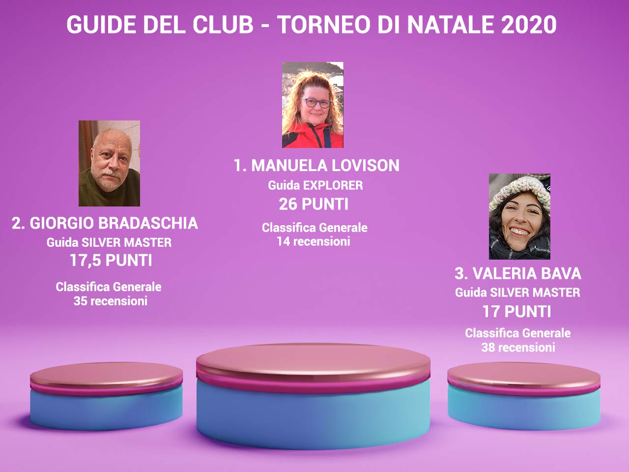 La Guida Explorer Manuela Lovison ha avuto la meglio su Giorgio Bradaschia, Guida Silver Master che abbiamo conosciuto al Salone del Camper di Parma, che a sua volta ha staccato soltanto di un soffio Valeria Bava, anche lei Guida Silver Master a lungo tra le posizioni di vertice in classifica generale. A loro vanno tanti regali, le nostre congratulazioni e l’invito a continuare ad aiutare la Community con tante recensioni sull’App PLEINAIRCLUB.