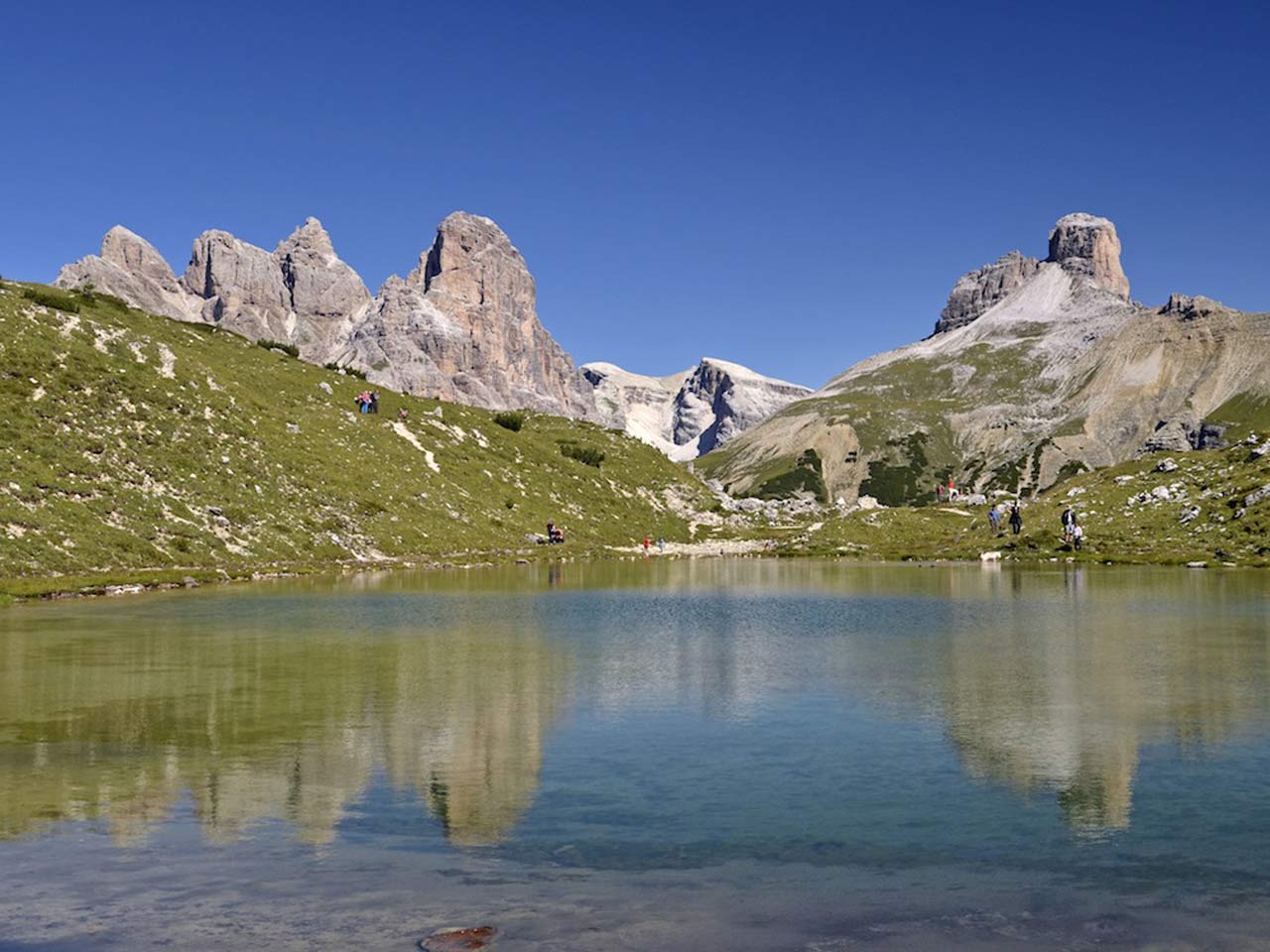 Il sentiero aggira il dirupato fianco occidentale delle Tre Cime e, proseguendo largo e facile, ci conduce alle suggestive Paludi di Col Forcellina proprio sotto i monoliti, dove fra lanosi prati di erioforo si specchiano le vette del panorama circostante.