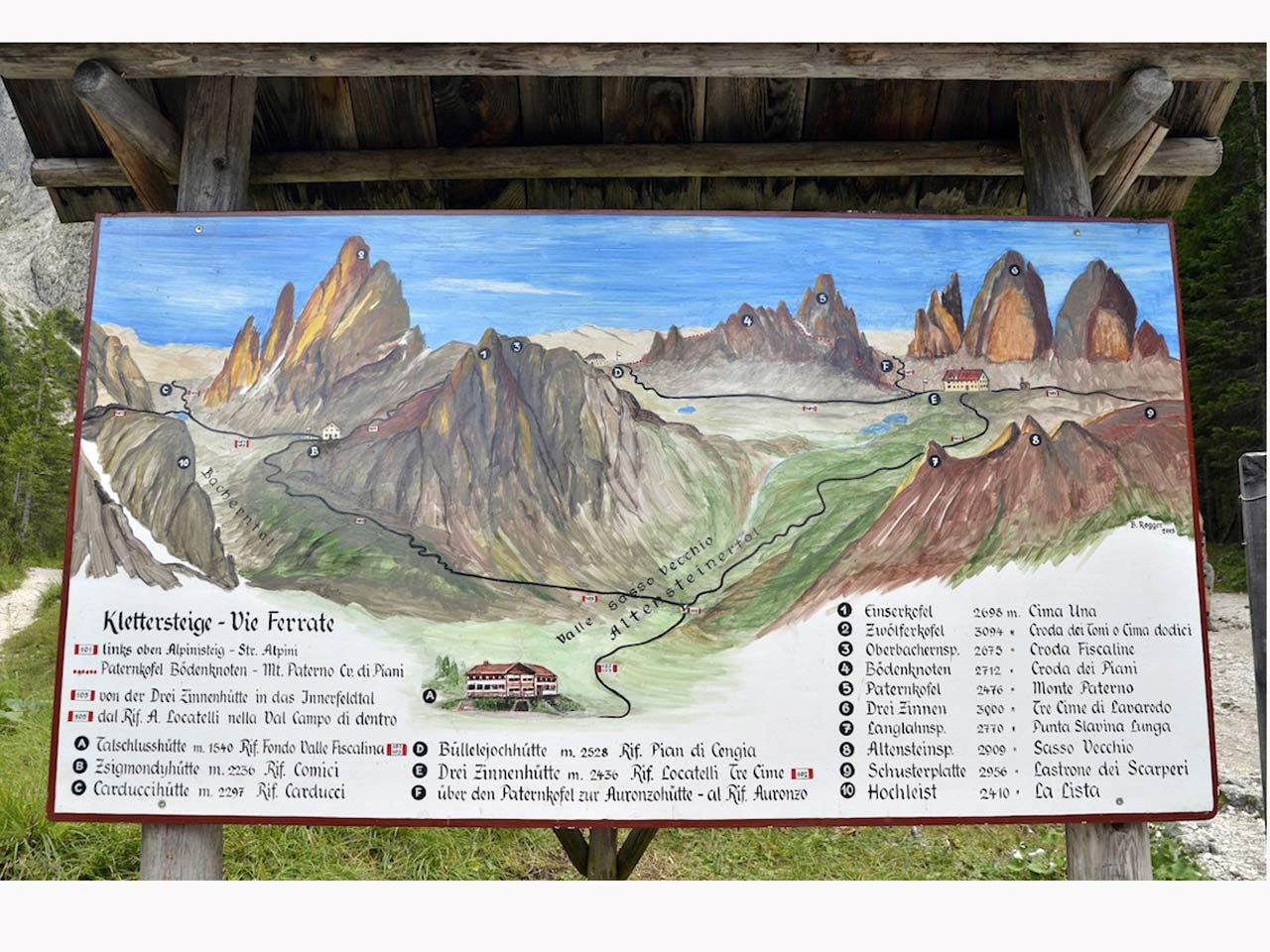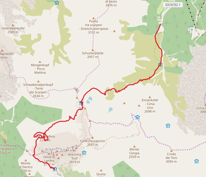 Roadmap Dal Rifugio Auronzo (2.330 m) per la Forcella Col di Mezzo (2.315 m, +30 min.), le paludi di Col Forcellina (2.245 m, +25 min.), il Rifugio Antonio Locatelli (2.405 m, +1,15 h), la Val del Sasso Vecchio, il Rifugio al Fondovalle (1.526 m, +1,50 h) e il parcheggio della Val Fiscalina (1.460 m, +20 min.), dove si prende l’autobus per Sesto.
