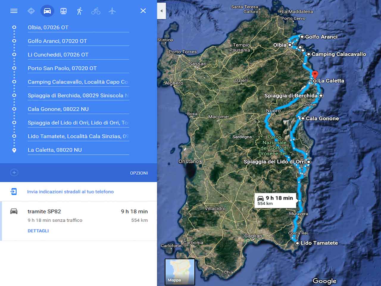 Programmiamo, organizziamo, ci informiamo prima delle vacanze e partiamo per questo nostro primo viaggio in Sardegna con una bella cartina, con tante note, appunti, aree sosta, campeggi, prezzi, ecc. Pensiamo di girarla in lungo e in largo, un po’ in base al vento, un po’ in base a come andrà. Insomma, informati su tutto ma senza nessuna meta precisa. L’unica destinazione che ci prefissiamo è quella della prima sera, per avere un posto sicuro dove andare a dormire: Cala Banana, consigliata da tanti camperisti come ottimo punto di partenza per chi arriva ad Olbia.